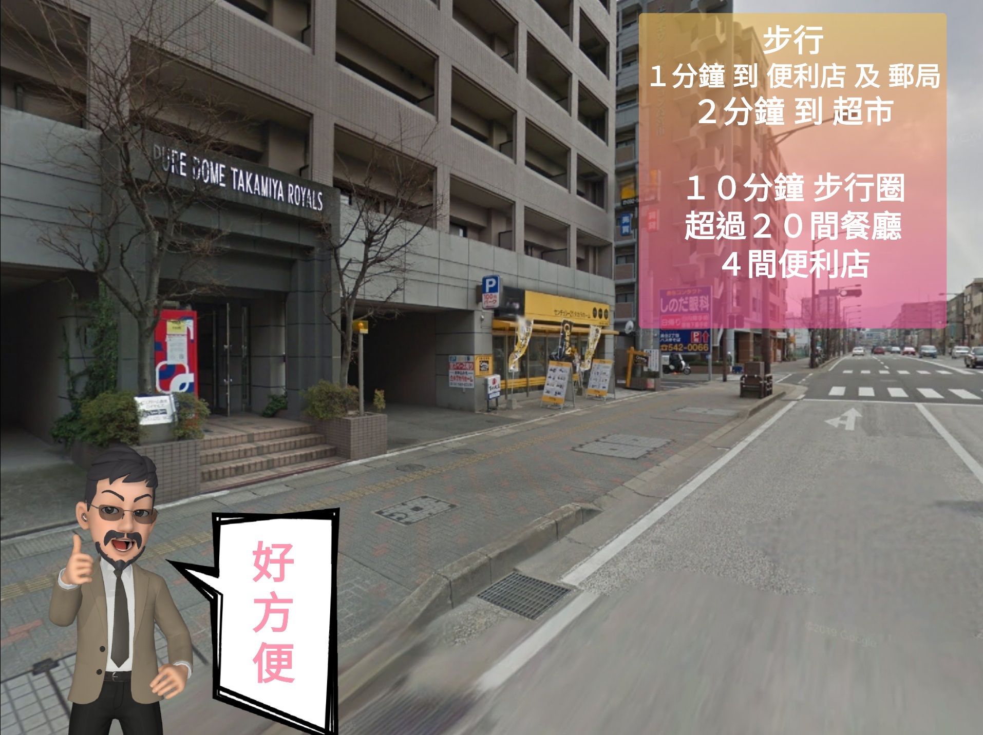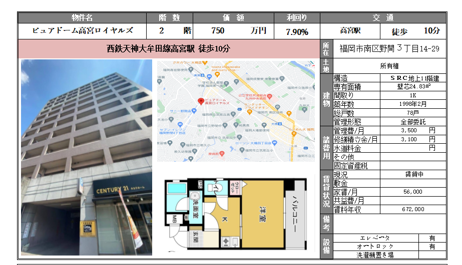 物業位於福岡市南區,步行1分鐘到便利店及郵局;2分鐘到超市,日常生活超方面,10分鐘步行圈有超過20間餐廳,多種美食,任君選擇。物業最近鐵路為高宮車站,步行只係約10分鐘,鐵路一線到天神,僅需約8分鐘。