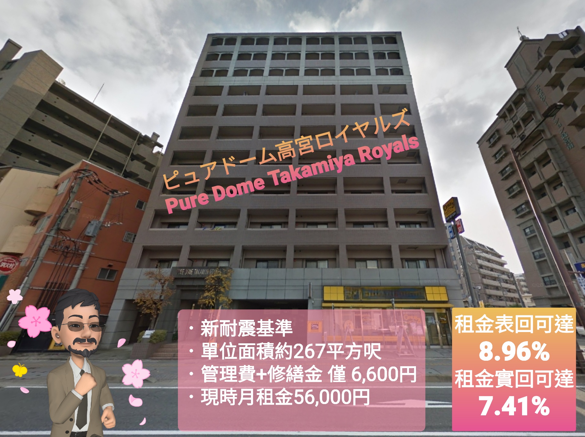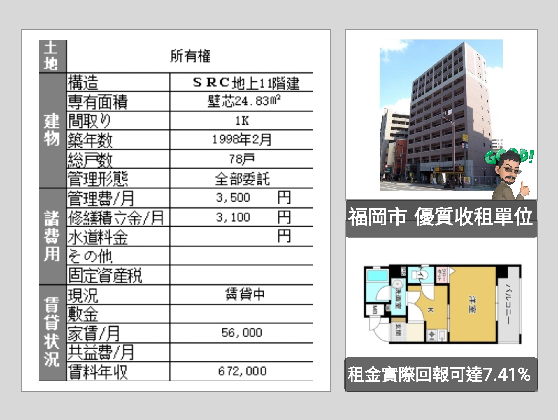 單位現時已有租客,現時租金每月56,000円,扣除管理費,修繕金及租管費用後,租金回報可達7.41%!!