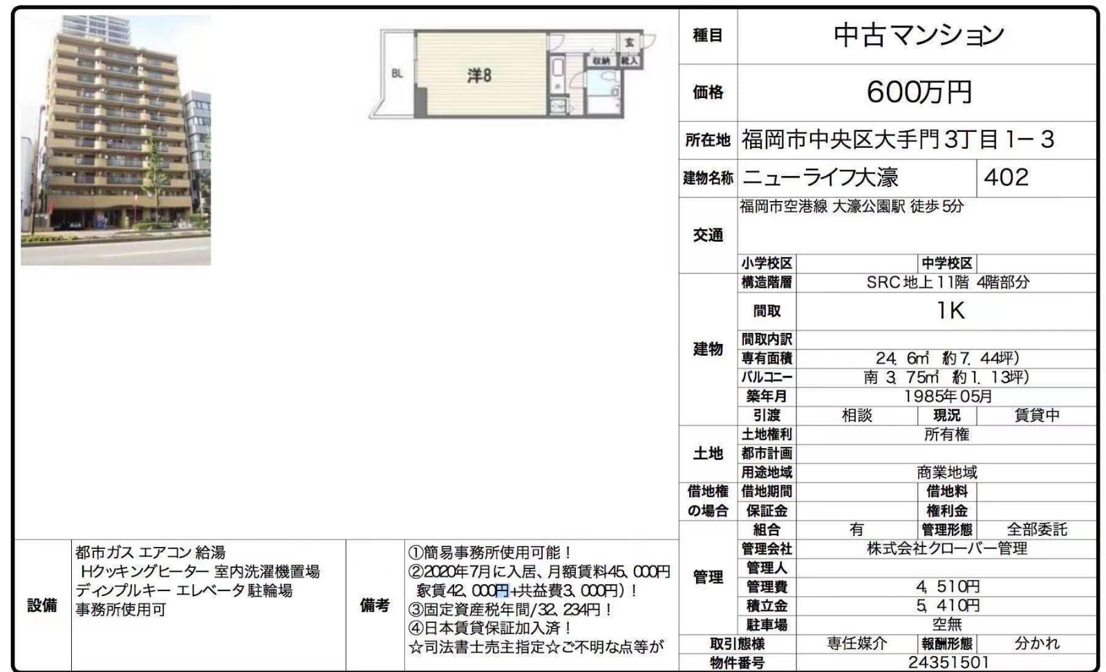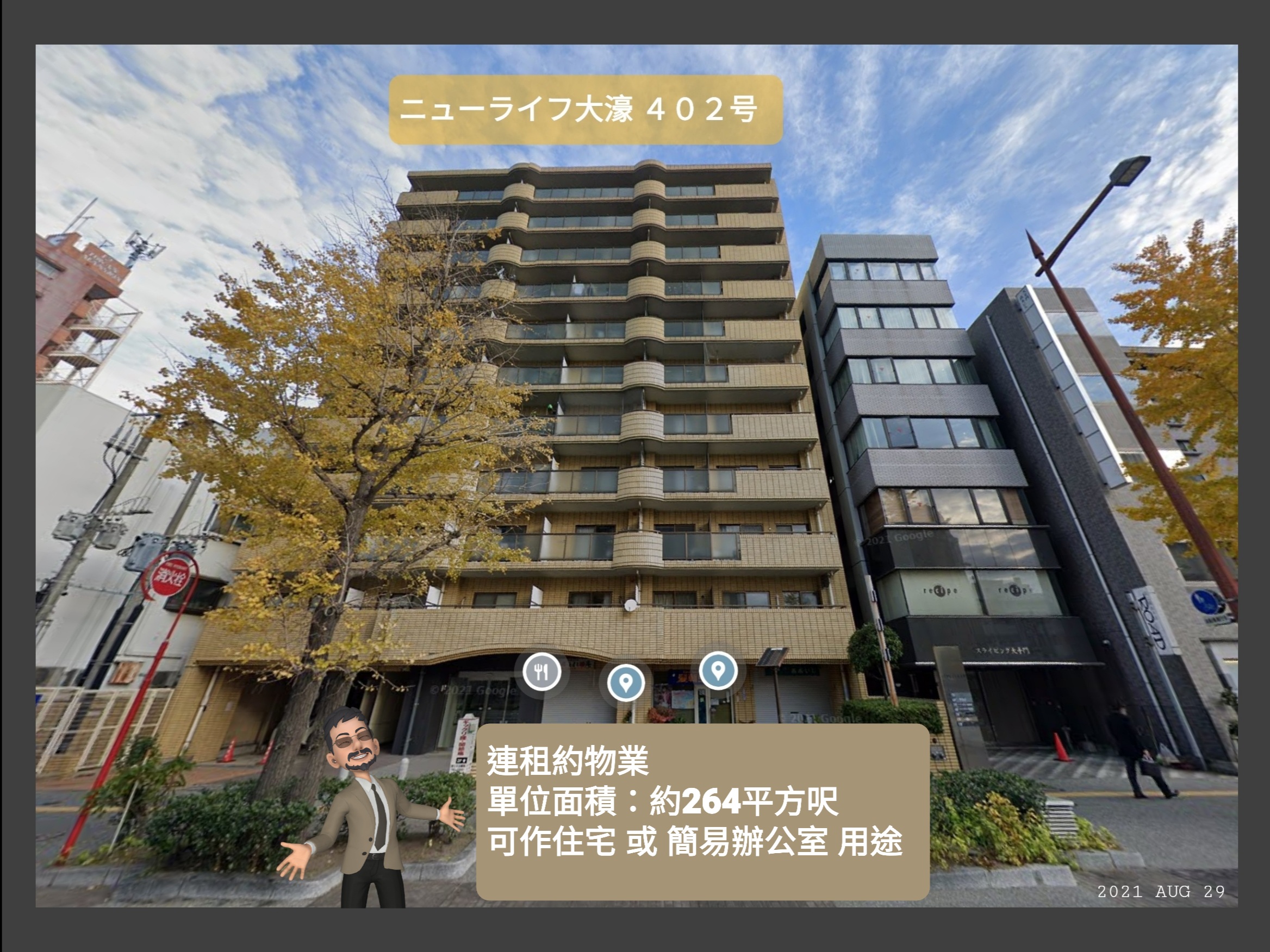 大廈建於1985年,新耐震基準物業,構造物料為SRC,共11層。推薦單位在4樓402號室,面積約264平方呎,比同類型的物業面積大,露台面積亦有約40平方呎。物業除了可做住宅外,亦可作簡易事務所使用,投資價值看高1線。