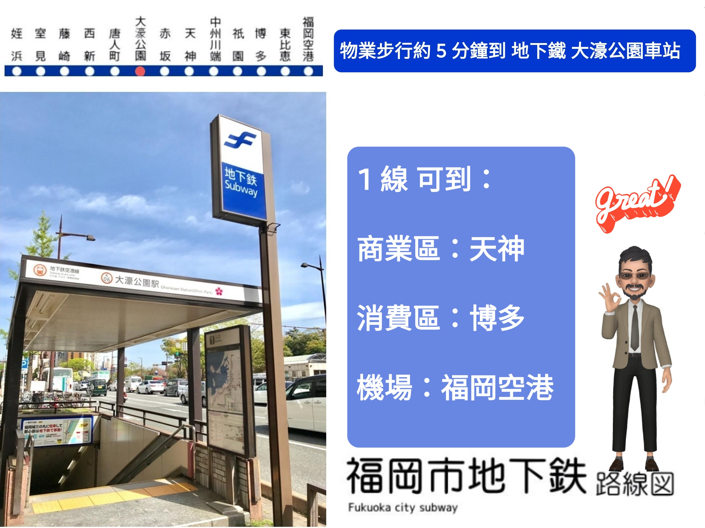 物業位福岡市中央區大手門,大廈門口的行人路及馬路寬闊,加上行人路沿途種植樹木,出入感覺舒服。物業周邊有銀行,便利店及多間食店,步行到地下鐵 大濠公園車站只需約5分鐘,生活機能方便。